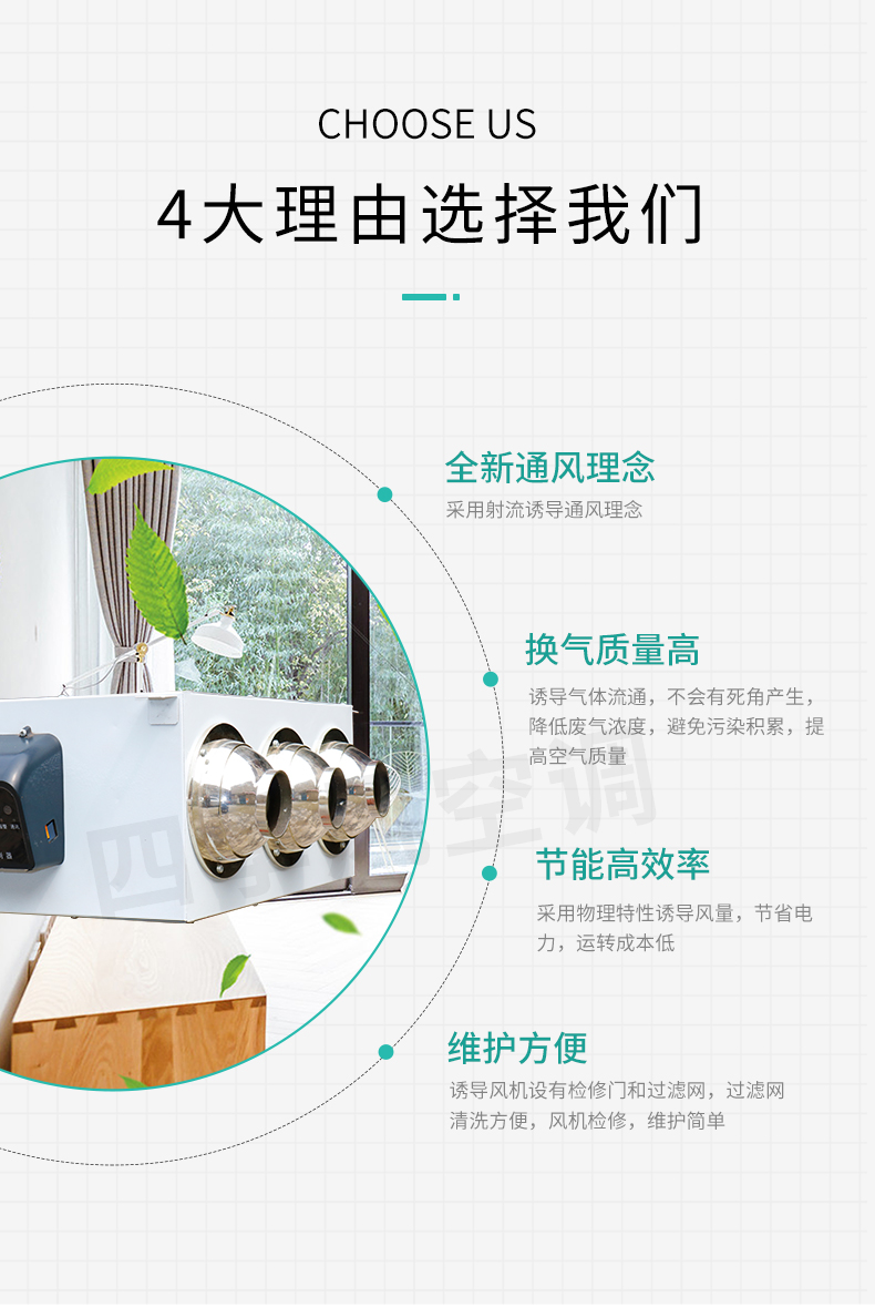 靖江市四季風空調設備有限公司——智能型誘導風機是無管道射流誘導通風系統的一部分,它與送風風機、排風風機組成整個系統。使用無管道射流誘導通風系統時,可省去設計、制造、安裝風管及其他配套工程方面的費用,這部分費用比使用的誘導風機機組昂貴得多